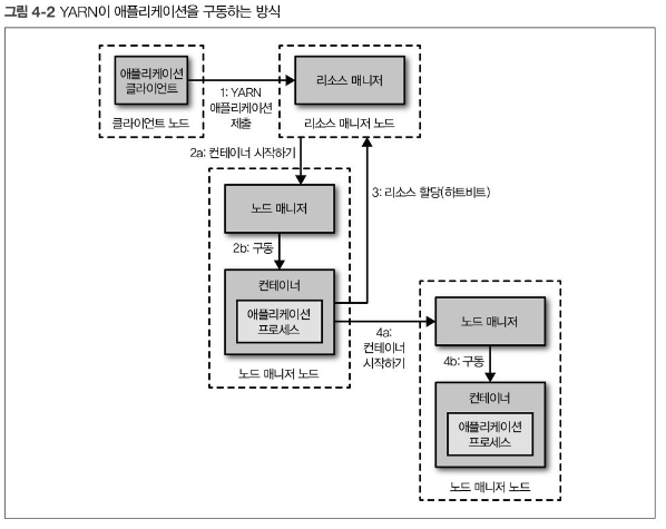 - 클라이언트는 리소스매니저에 접속. 애플리케이션을 구동하기 위해 애플리케이션 마스터 프로세스의 구동을 요청