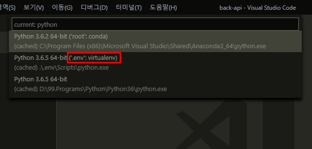 아래화면같이 다양한 파이썬이 뜰테지만, 윗단계에서 만들어준 가상환경이 셋팅되어있는 파이썬을 클릭하자.