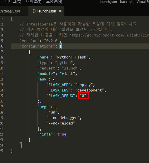 그리고 launch.json 파일이 만들어졌을텐데, 아래와 같이 파일을 수정한다. Flask Debug 부분이 0으로 비활성화 되어있을텐데