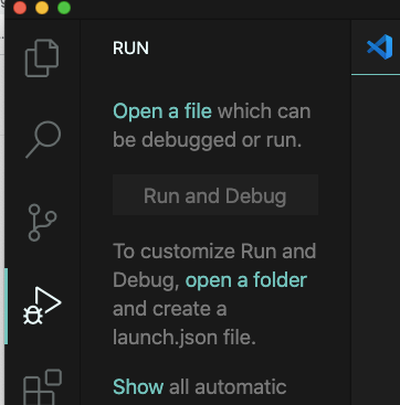 3. 그럼 다시 VSC의 왼쪽 화면에서 벌레 모양 아이콘을 클릭하면 아래와 같은 창이 뜰것이다.