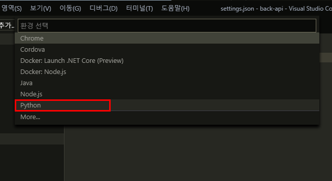 클릭하면 아래와 같은 화면이 뜬다. 환경을 python으로 설정해주고