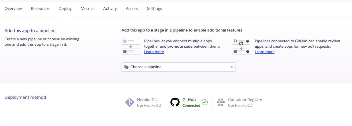 7. deploy 탭을 들어가면 아래와 같은 화면이 뜨고, 더 아래에 git 과 connect 하겠냐는 명령어가 뜬다.