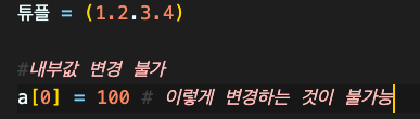 - 한번 선언하면 내부 값을 변경할 수 없다. (따라서 list에서 쓸 수 있는 기능 중에서, append나 reverse 같이 내부 요소를 변화시키는 기능은 사용할 수 없다)
