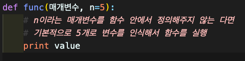 -> 매개변수를 혼용해서 쓸 경우, 순서는 일반 매개변수, *가변 매개변수, 기본 매개변수=5