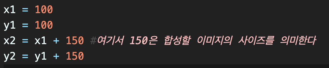 위의 의미는 합성할 이미지의 시작점. 즉 왼쪽 가장 윗 점의 위치가 (100,100) 이고, 거기서 합성할 이미지의 사이즈인 150을 더해주면 이미지의 전체 위치가 나오는 것이다,