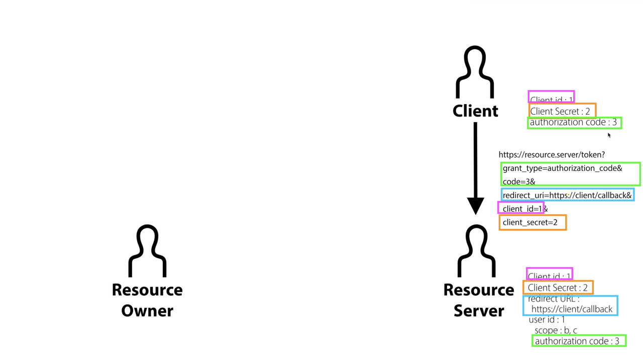 - 이 때 서비스제공자인 "나"가 소셜서비스로 접속할때 가지고 간 주소링크에서 Authorizaion code와 clientID, client secret, redirect URL이 모두 일치하는지를 확인한다.