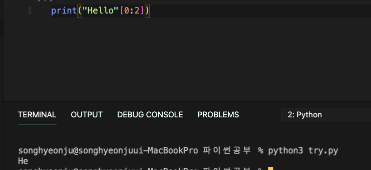 -> 앞 숫자의 인덱스 부터 뒷 숫자-1 인덱스 까지의 문자열을 선택해서 출력
