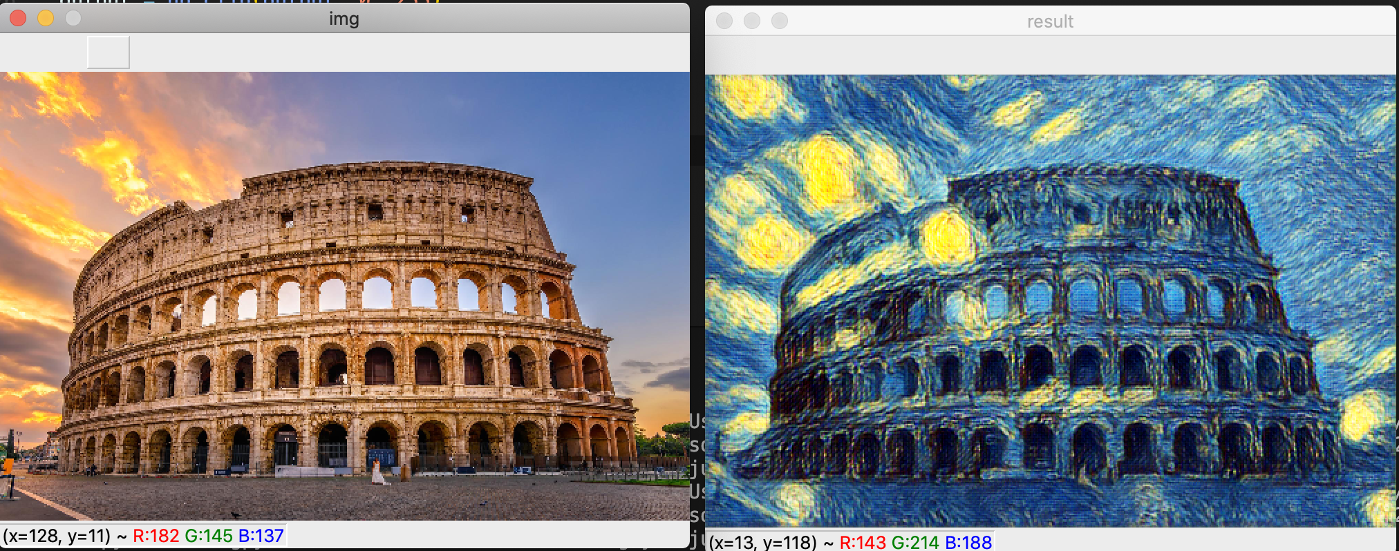 딥러닝 모델은 고흐의 별이 빛나는 밤에 였다. 해당 화풍을 내가 원하는 이미지에 씌워보는 이미지 처리를 진행해 본것!