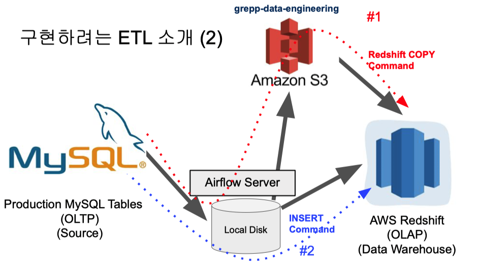 -> S3 에서 redshift로의 작업이 가장 효율적이다. 같은 aws프로그램 내 + copy command사용